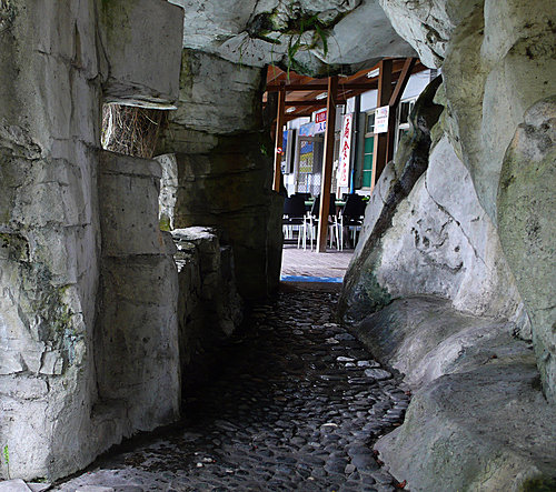 湖邊"山洞",瀑水就從洞頂流出落入湖中。