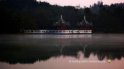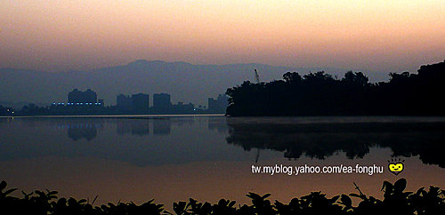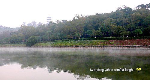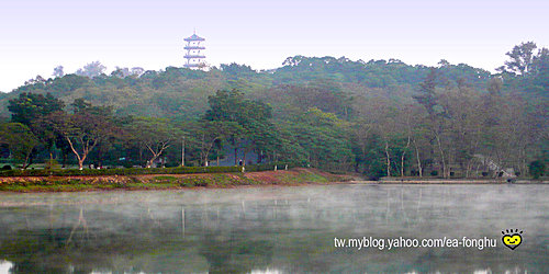 望向西邊中興塔方向澄清湖清晨-的湖霧更美