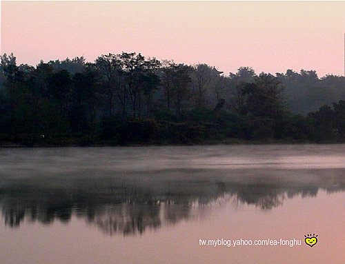 ---天氣冷,巧遇陽光斜照,背景陰暗,湖面結霧氣,難得的美景。