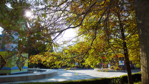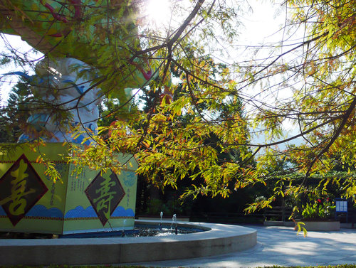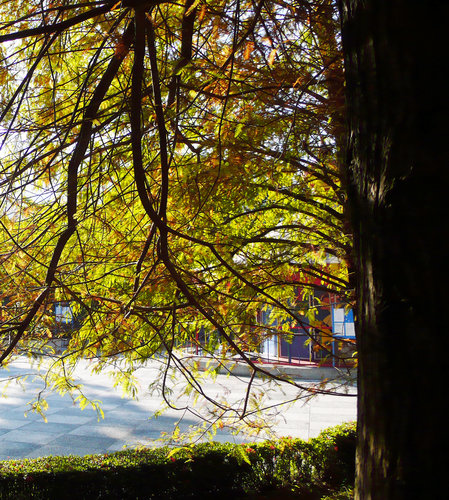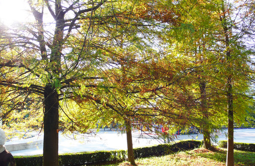 落羽松冬天葉子在逆光中特別顯眼,呈金黃色。