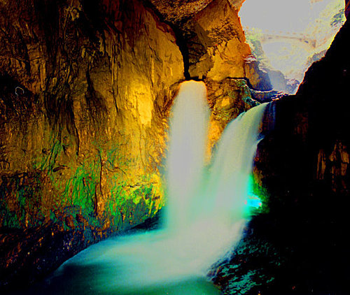 洞穴瀑布以雌雄瀑布景為著名,因水至懸崖處遇阻分為兩股,奔瀉而下又合二為一,故命名為雌雄雙瀑。雌雄瀑布落差極大,瀑布高30米,流量大,最大流量為320立方米/秒。