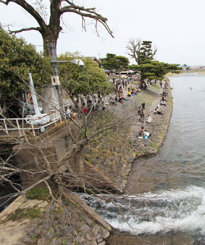 慵懶人們的坐姿與背景渡月橋,形成了絕佳的配對。