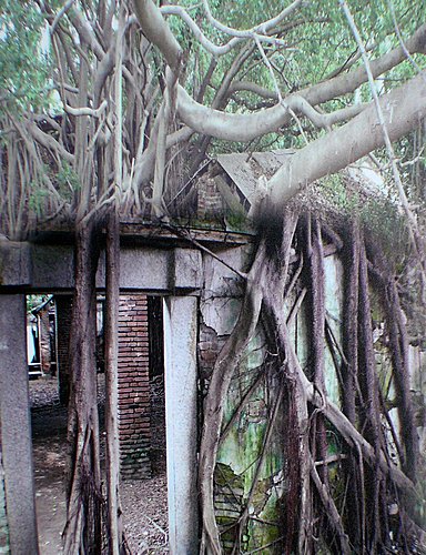 老榕樹氣根自然而然自損壞的屋頂垂下攀附生根,形成「樹以牆為幹、屋以葉為瓦」的特殊景觀。