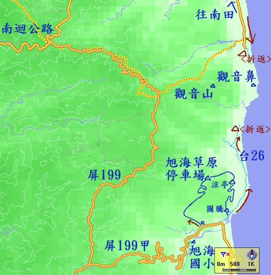 2.由恆春鎮東門→外接屏200號道經滿州鄉→過港仔轉接台6號直走到底→即可到達旭海村。