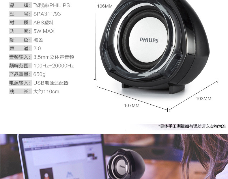 Philips/飛利浦 SPA311/93筆記本電腦音響臺式小音箱迷你低音炮 500元