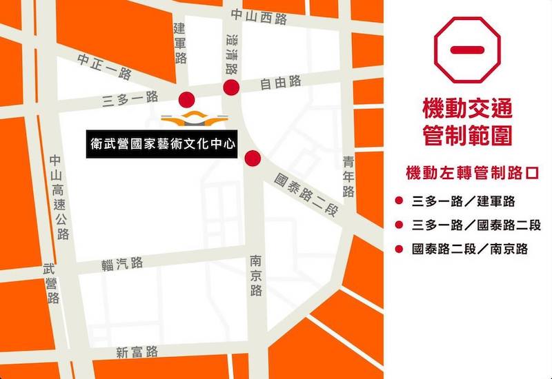 - 衛武營東側汽車停車場:平日每半小時15元、假日每半小時20元,當日最高300元。